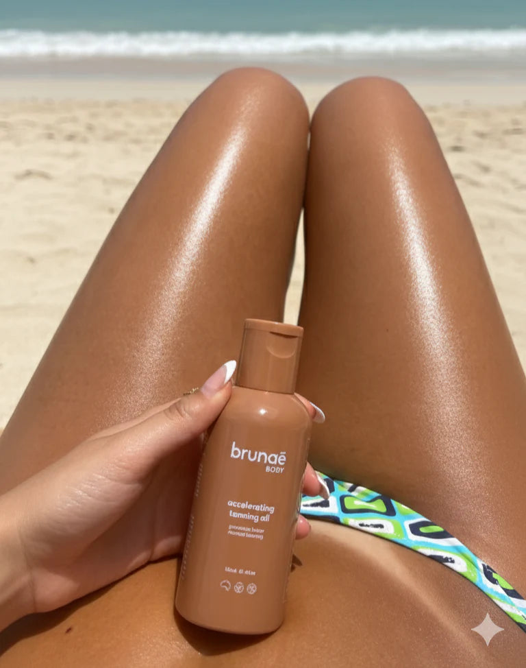 BRUNAE potencia tu bronceado desde la primera exposición, nutre tu piel y te ayuda a lograr un tono dorado más rápido, más intenso y mucho más uniforme.